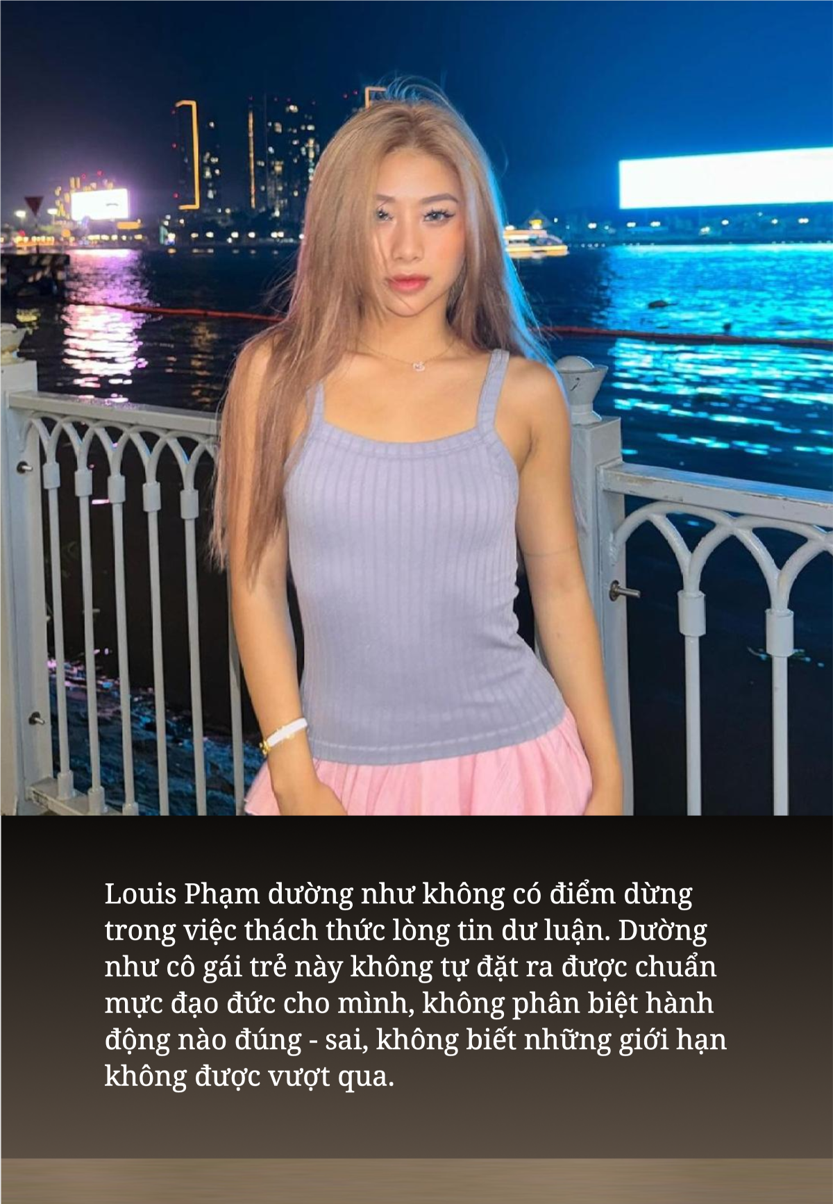 Louis Phạm dường như không có điểm dừng trong việc thách thức lòng tin dư luận. Dường như cô gái trẻ này không tự đặt ra được chuẩn mực đạo đức cho mình, không phân biệt hành động nào đúng - sai, không biết những giới hạn không được vượt qua.