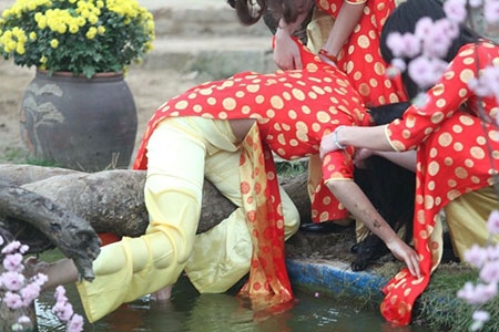 Trước đó, một cô bạn khác cũng gặp phải tai nạn mà không ai muốn có. Vì quá mải mê ngắm hoa, tạo dáng, cô gái này đã trượt chân ngã xuống hồ. Mai sao, bộ trang phục của cô chỉ bị ướt và lấm đôi chút bùn.