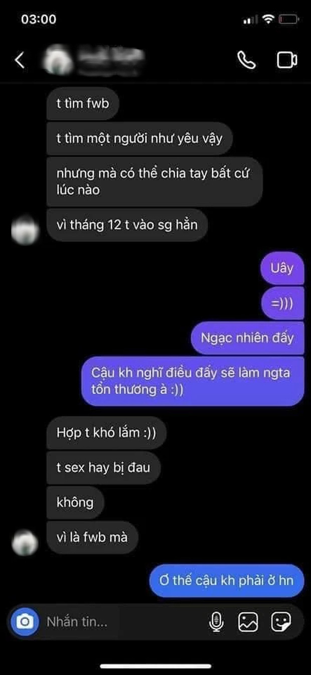 Ngoài ra, một đoạn tin nhắn H.N chủ động tìm kiếm một mối quan hệ FWB "như tìm một người yêu" và có thể chia tay bất cứ lúc nào vì sắp chuyển hẳn vào Sài Gòn.