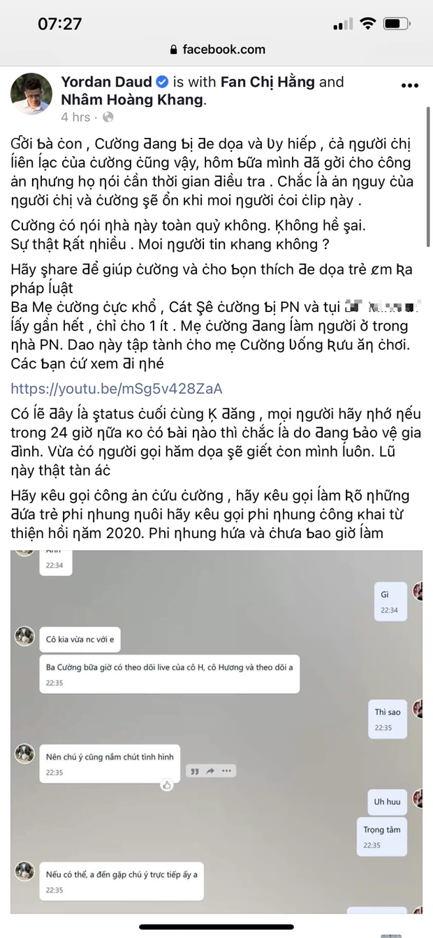 Có lẽ đây là status cuối cùng Khang đăng, mọi người hãy nhớ nếu trong 24 giờ nữa không có bài nào thì chắc là do đang bảo vệ gia đình. Vừa có người hăm doạ sẽ giết con mình luôn. Lũ này thật tàn ác. Hãy kêu gọi công an cứu Cường, hãy kêu gọi làm rõ những đứa trẻ Phi Nhung nuôi, hãy kêu gọi Phi Nhung công khai từ thiện hồi năm 2020. Phi Nhung hứa nhưng chưa bao giờ làm".