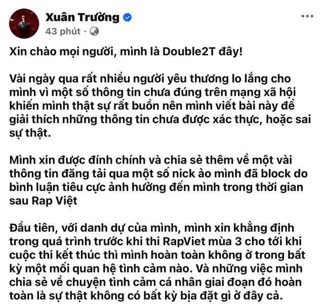 Mình xin được đính chính và chia sẻ thêm về một vài thông tin đăng tải qua một số nick ảo mình đã block do bình luận tiêu cực ảnh hưởng đến mình trong thời gian sau Rap Việt Đầu tiên, với danh dự của mình, mình xin khẳng định trong quá trình trước khi thi Rap Việt mùa 3 cho tới khi cuộc thi kết thúc thì mình hoàn toàn không ở trong bất kỳ một mối quan hệ tình cảm nào. Và những việc mình chia sẻ về chuyện tình cảm cá nhân giai đoạn đó hoàn toàn là sự thật không có bất kỳ bịa đặt gì ở đây cả.