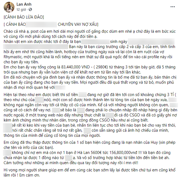 Theo lời tố cáo trên trang cá nhân của tài khoản Facebook Lan Anh, L.Q.H đã vay mượn của không chỉ cô mà còn không ít người, con số đó đã lên tới 3 tỷ đồng. Đặc biệt hơn, một phần trong số tiền này L.Q.H đã dùng để tham gia cá độ các trận đấu CS:GO.
