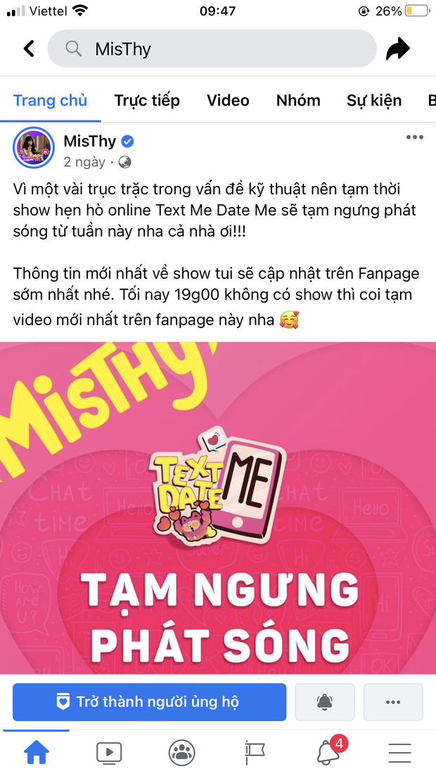 Theo dõi Facebook của MisThy, thì cũng có thể phát hiện ra trong bài đăng về chương trình Text Me Date Me của cô đã phải tạm ngưng phát sóng vì "trục trặc trong vấn đề kỹ thuật". Nhiều người cũng cho rằng, rất có thể kênh YouTube của MisThy đã vi phạm gì đó.