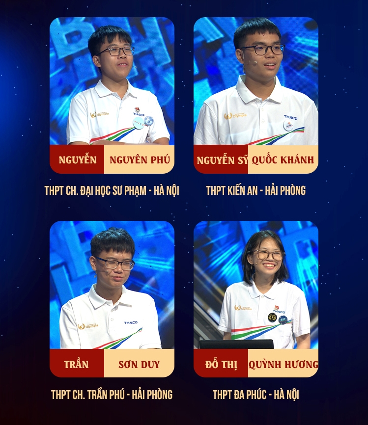 Vậy là, trận thi Quý 4 - trận thi Quý cuối cùng của Đường Lên Đỉnh Olympia 2024 đã chính thức lên sóng. Trận thi Quý 4 của Đường Lên Đỉnh Olympia 2024 là cuộc tranh tài kịch tính của 4 thí sinh: Nguyễn Nguyên Phú (THPT chuyên Đại học Sư phạm - Hà Nội), Nguyễn Sỹ Quốc Khánh (THPT Kiến An – Hải Phòng), Đỗ Thị Quỳnh Hương (THPT Đa Phúc – Hà Nội) và Trần Sơn Duy (THPT chuyên Trần Phú – Hải Phòng).