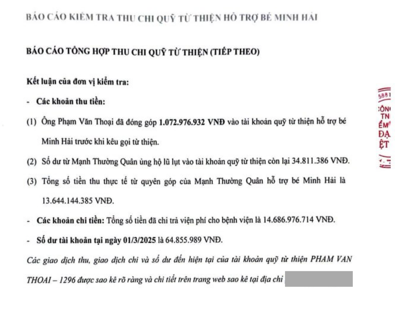 Phạm Thoại cam kết minh bạch: "Mọi khoản thu – chi đều đã được đối chiếu và xác minh qua kết quả kiểm tra của công ty kiểm toán độc lập. Thoại mong rằng, với những tài liệu được cung cấp trong báo cáo kiểm tra này, mọi người có thể yên tâm rằng số tiền đã được sử dụng đúng đắn, minh bạch đúng với mục đích ban đầu khi kêu gọi".