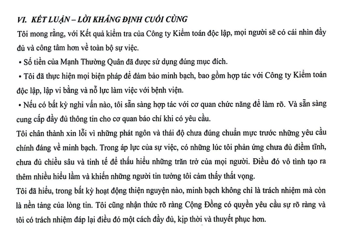 "Tôi chân thành xin lỗi vì những phát ngôn và thái độ chưa đúng chuẩn mực trước những yêu cầu chính đáng và minh bạch. Trong áp lực của sự việc, có những lúc tôi chưa đủ điềm tĩnh, chưa đủ chiều sâu và tinh tế để thấu hiểu những trăn trở của mọi người. Điều đó vô tình tạo ra thêm nhiều hiểu lầm và khiến những người tin tưởng tôi cảm thấy thất vọng".