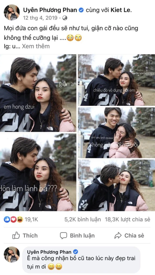 Thay vì chọn cách block hay xoá luôn những hình ảnh thời còn yêu Anh Kiệt, Phương Uyên giữ lại toàn bộ và khi bị dân mạng đào lại, cô nàng vẫn bình thản trả lời từng bình luận một. Chưa kể cô còn khen bạn trai cũ nhìn khá đẹp trai khi xem hình thời còn mặn nồng.