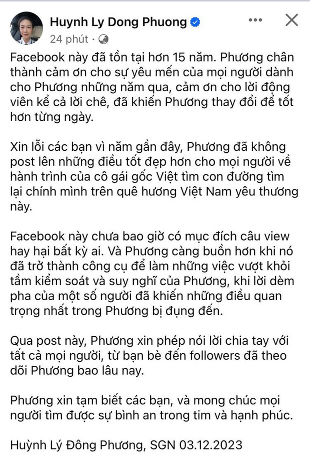 Qua post này, Phương xin phép nói lời chia tay với tất cả mọi người, từ bạn bè đến followers đã theo dõi Phương bao lâu nay. Phương xin tạm biệt các bạn, và mong chúc mọi người tìm được sự bình an trong tim và hạnh phúc".
