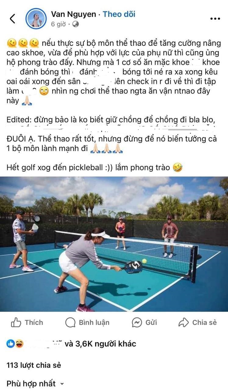 "Đừng bảo là không biết giữ chồng để chồng đi. Thể thao rất tốt, nhưng đừng để nó biến tướng cả 1 bộ môn lành mạnh…", chủ nhân của bài đăng dậy sóng MXH giữa trào lưu Pickleball chính là Vân Nguyễn – kinh doanh tự do.