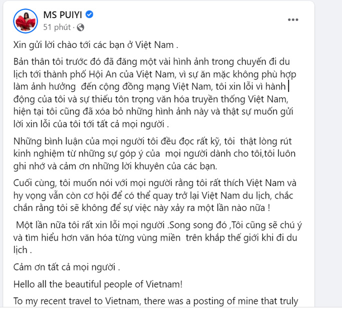 Tối 6-4, trên Facebook cá nhân, tài khoản MS PUIYI – nữ du khách người Malaysia đang khiến cộng đồng mạng "dậy sóng" vì chụp ảnh "khoe mông" trong trang phục áo dài truyền thống của Việt Nam trên sông Hoài (TP Hội An, tỉnh Quảng Nam) - đã đăng tải bài viết có nội dung xin lỗi mọi người.