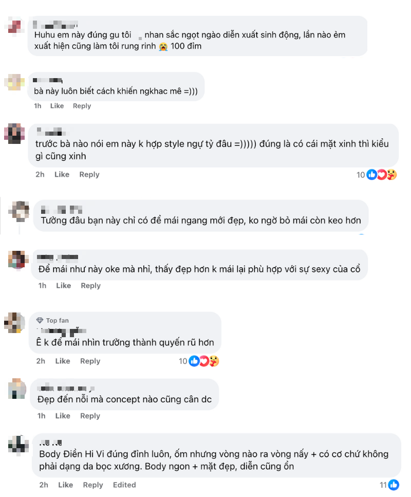 "Tưởng đâu bạn này chỉ để mái ngang mới đẹp, không ngờ bỏ mái còn keo hơn", "Trước ai nói em này không hợp style ngự tỷ đâu, đúng là mặt xinh kiểu gì cũng hợp", "Không để mái nhìn trưởng thành quyến rũ hơn", "Đẹp đến nỗi concept nào cũng cân được"...