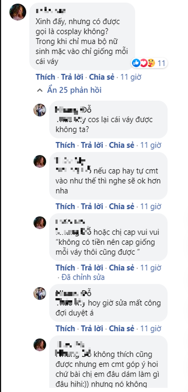 Người thì dành lời khen ngợi về nhan sắc cũng như thần thái của nữ game thủ này. Tuy nhiên một số bình luận khác thì lại cho rằng “xinh đấy, nhưng có được gọi là cosplay không? Trong khi chỉ mua bộ nữ sinh mặc vào chỉ giống mỗi cái váy”. Tất nhiên, việc cosplay nhân vật trong game sẽ không thể tránh khỏi những bình luận khen chê, song cũng không thể phủ nhận được sự cuốn hút của bài đăng này khi chỉ trong vòng 12 tiếng ngắn ngủi đã thu về gần 2.5 lượt cảm xúc, gần 500 bình luận.
