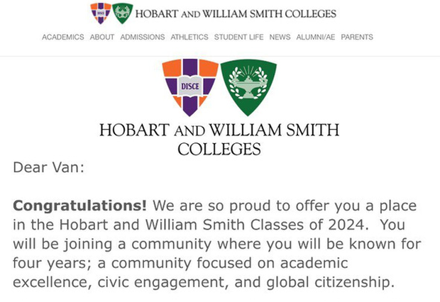Tạm dịch nội dung email của trường HWS gửi Diệu Vân: "Xin chúc mừng! Chúng tôi rất vinh dự bạn đã trở thành một trong những thành viên của trường HWS, khoá 2024. Bạn sẽ có 4 năm học tại trường - nơi cho bạn kết nối với những cá nhân có thành tích xuất sắc trong học tập, sự hoà nhập cộng đồng, các công dân toàn cầu.