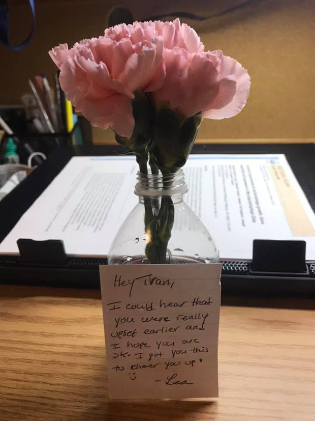 Đến buổi tối, mình thấy bạn cùng ký túc xá của mình để 1 bình hoa nhỏ trên bồn rửa mặt. Bạn ghi 'Hey Tran, I could hear that you were really upset earlier and I hope you are ok. I got you this to cheer you up. - Lea (tên bạn đó)'. (Tạm dịch là: Chào Trân, tui nghe thấy bạn thực sự rất buồn lúc nãy và tui hy vọng bạn ổn. Tui cho bạn cái này để làm bạn vui lên). Sau 3 năm ở Mỹ, lần đầu tiên khiến mình cảm thấy bát cháo hành này nhiều tiêu đến vậy!".