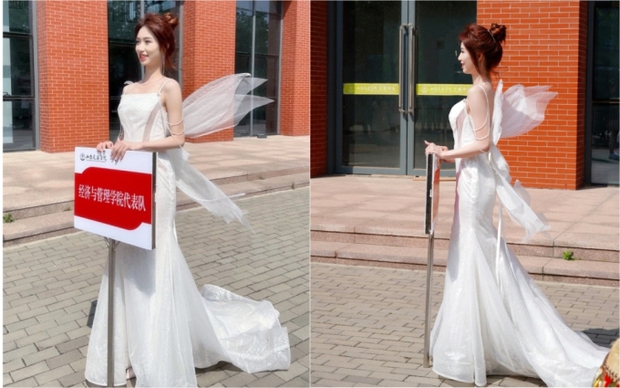 Theo đó, nữ sinh này diện một chiếc váy trắng khá đơn giản, không phụ kiện cầu kỳ cũng không khoét trên hở dưới. Thế nhưng, chiếc váy vẫn có một điểm nhấn đặc biệt đó là tạo hình đôi cánh sau lưng. Kết hợp với gương mặt thanh thoát, khả ái của nữ sinh, trông cô nàng thực sự giống một thiên thần. Nhiều người nhận xét tuy nữ sinh này không xinh đẹp kiểu sắc sảo hay rực rỡ nổi bật, song lại mang đến cho người đối diện một cảm giác rất dễ chịu, càng ngắm càng thấy duyên.