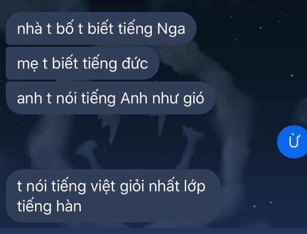 Một nữ sinh mới đây đã chia sẻ đoạn chat ngắn giữa mình và một người bạn. Người bạn này đã có màn khoe lý lịch gia đình vô cùng chất khi cho biết cả nhà ai cũng giỏi ngoại ngữ cả. Trong khi bố biết tiếng Nga, mẹ nói được tiếng Đức thì anh trai có thể sử dụng tiếng Anh như gió. Riêng về người bạn này, bạn cũng cho biết mình đang theo học một lớp tiếng Hàn, nhưng về trình độ thì.... nói tiếng Việt giỏi nhất lớp!