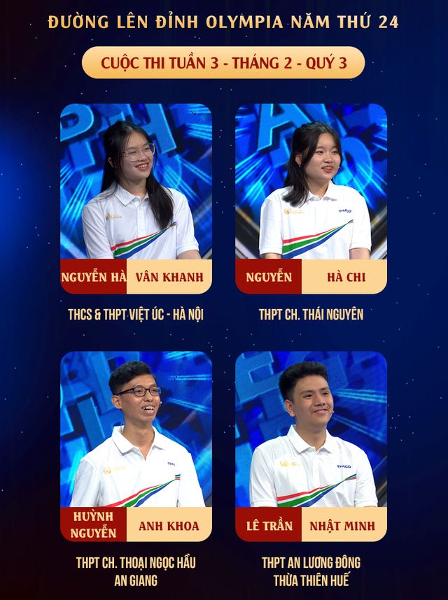 Cuộc thi Đường Lên Đỉnh Olympia Tuần 3 Tháng 2 Quý 3 năm thứ 24 phát sóng ngày 26/5 trên VTV3 là cuộc so tài của 4 nhà leo núi: Nguyễn Hà Vân Khanh (trường THCS&THPT Việt Úc, Hà Nội); Nguyễn Hà Chi (trường THPT chuyên Thái Nguyên); Huỳnh Nguyễn Anh Khoa (trường THPT chuyên Thoại Ngọc Hầu, An Giang); Lê Trần Nhật Minh (trường THPT An Lương Đông, Thừa Thiên Huế).