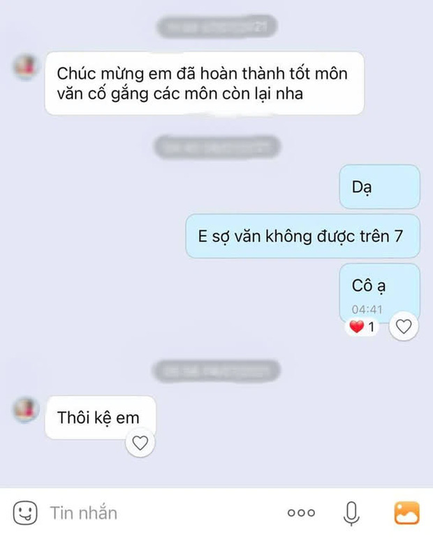 Mới đây, một nữ sinh đã chia sẻ câu chuyện siêu hài hước của mình khi thông báo điểm cho cô giáo. Cụ thể, khi thấy cô giáo động viên: "Chúc mừng em đã hoàn thành tốt môn Văn, cố gắng các môn còn lại nha". Cô học trò đã thành thật thú nhận: "Dạ, em sợ Văn không được trên 7 điểm".