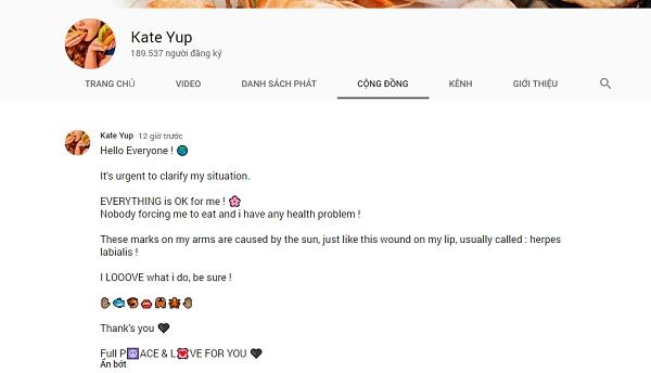 Tuy nhiên, chỉ cách đây vài giờ, Kate Yup đã lên tiếng thanh minh ngay trên tài khoản Youtube.