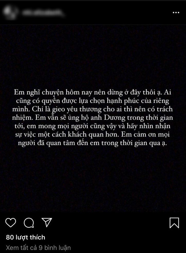 Nguyên văn status của D.N: "Em nghĩ chuyện hôm nay nên dừng lại ở đây thôi ạ. Ai cũng có quyền được lựa chọn hạnh phúc của riêng mình. Chỉ là gieo yêu thương cho ai thì nên có trách nhiệm. Em vẫn sẽ ủng hộ anh Dương trong thời gian tới, em mong mọi người cũng vậy và hãy nhìn nhận sự việc một cách khách quan hơn. Em cảm ơn mọi người đã quan tâm đến em trong thời gian qua ạ".