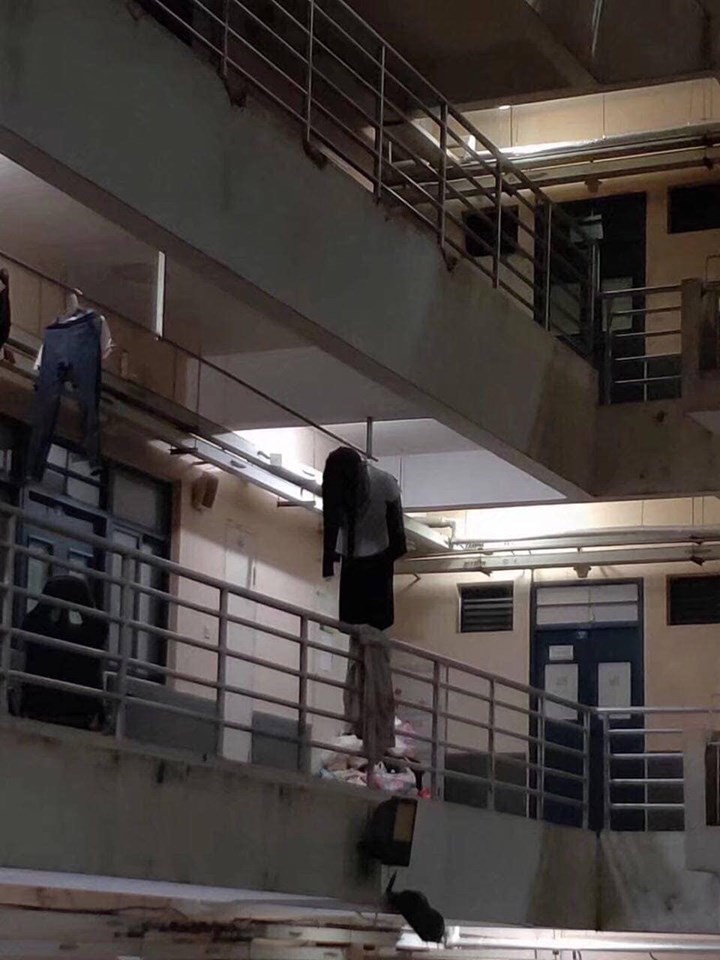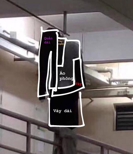 Thế nhưng, sau khi "hoàn hồn" lại, nhiều người đã phát hiện ra sự thật "éo le" đằng sau bức ảnh gây hoang mang này. Trên thực tế, chẳng có ai tự tử ở hành lang kí túc cả, tất cả chỉ là vài bộ quần áo phơi trên dây vô tình xếp thành hình thù kì dị mà thôi.