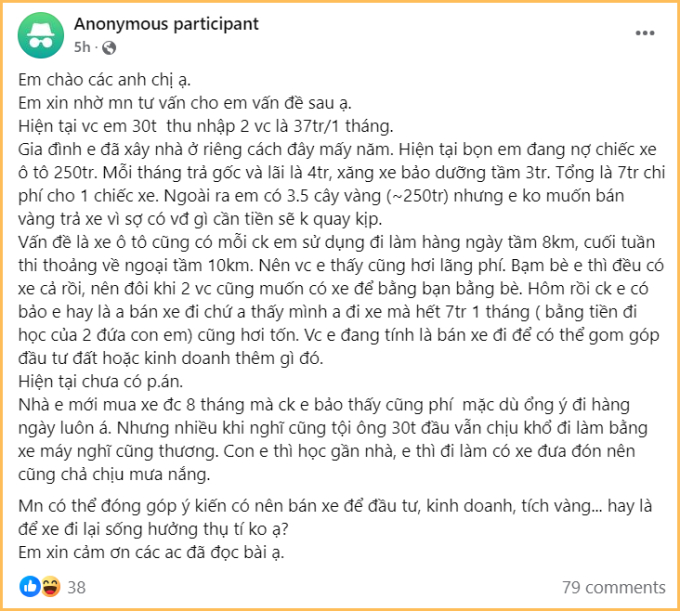 Mới đây, trong một cộng đồng chia sẻ kinh nghiệm, kiến thức quản lý tài chính, tâm sự của một cô vợ khiến nhiều người đọc xong phải “thả haha”. Chuyện là vợ chồng chị quyết định vay 250 triệu đồng mua ô tô cho bằng bạn bằng bè, mỗi tháng trả cả gốc cả lãi hết 4 triệu, cộng thêm 3 triệu chi phí nuôi xe, vậy là hết tổng cộng 7 triệu/tháng.