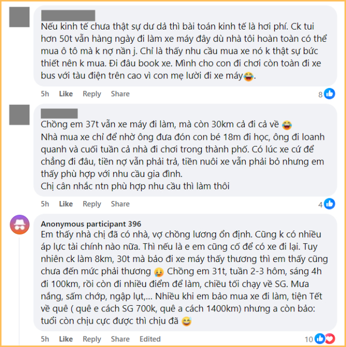 Trong phần bình luận của bài đăng, nhiều người cho rằng nhà chị nên bán xe, vì kinh tế chưa dư dả, nhu cầu đi lại cũng không nhiều. Hơn nữa, đàn ông sức dài vai rộng, lại mới 30 tuổi, đi xe máy 16km/ngày thì có gì to tát đâu mà phải thương…