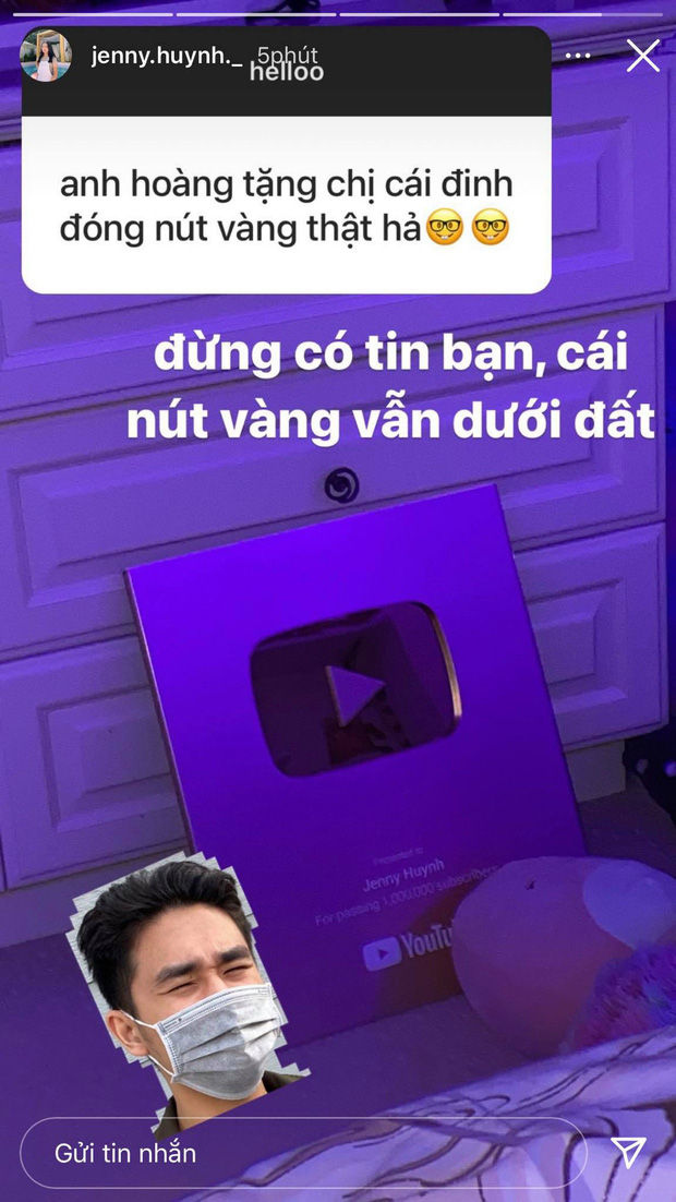 Mới đây, cặp anh em lại tiếp tục chứng minh sức hút của mình bằng màn đối đáp qua lại trên Instagram. Chuyện bắt đầu từ việc Jenny Huỳnh đăng ảnh check-in toàn bộ các nút vàng, bạc mà mình nhận được sau khi nút vàng YouTube về tay. Cùng thời gian, Hoàng Huỳnh cũng mở "đại hội" Q&A và nhận được câu hỏi: "Jenny được nút vàng, anh có tặng gì cho Jenny không?".