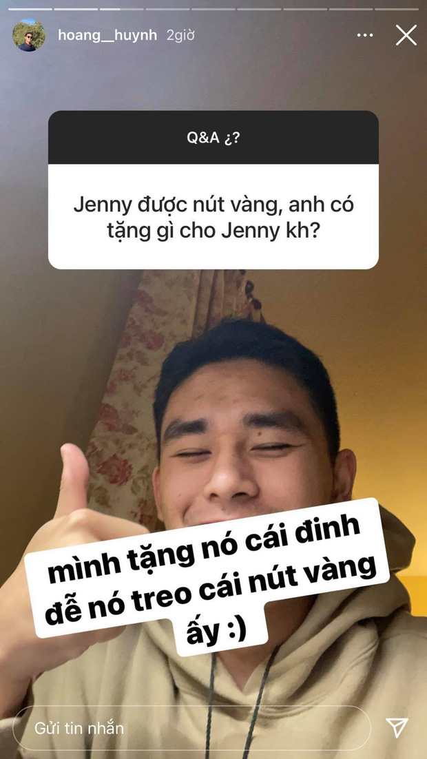 Bạn thử đoán xem câu trả lời là gì? Một món quà hay một bữa ăn nhà hàng? Đáp án của Hoàng Huỳnh không phải những điều thông thường trên mà là... một cây đinh. "Mình tặng nó cái đinh để nó treo cái nút vàng ấy" - anh trai Jenny Huỳnh cho biết.
