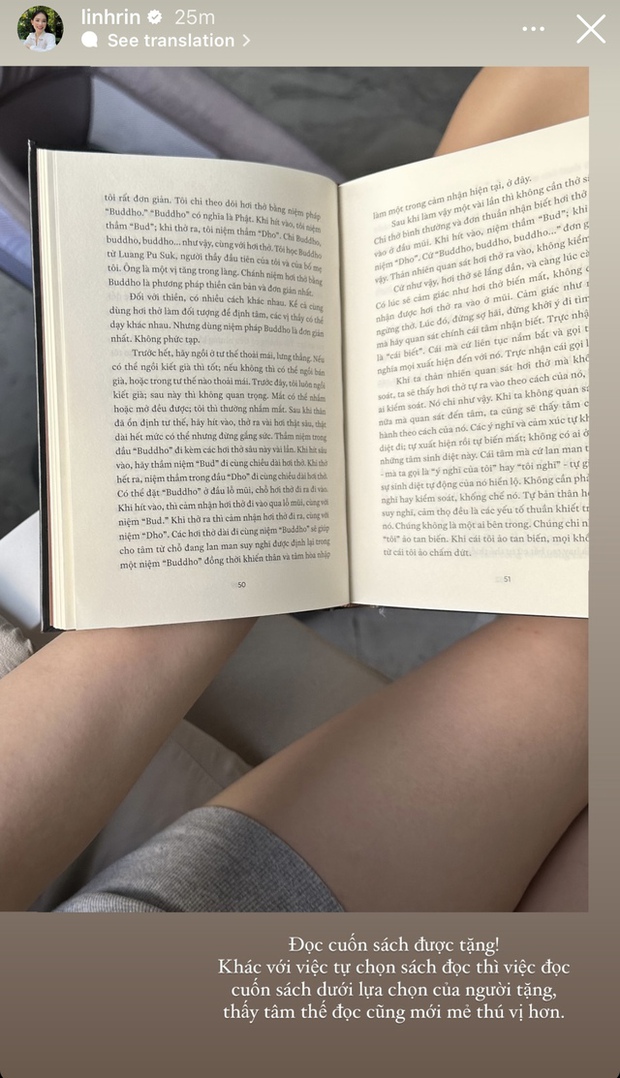 Mới đây, Linh Rin chia sẻ thời gian đọc sách thư giãn, chill chill của mình. Được biết, đây là cuốn sách được một người bạn tặng nên mẹ bỉm cảm thấy vô cùng hào hứng, tận hưởng khoảng thời gian này. Qua bức hình, nhiều người còn nhận thấy vóc dáng sau sinh của Linh Rin dường như không quá thay đổi. Cẳng tay hay đôi chân đều vẫn giữ được sự thon gọn, mảnh mai.