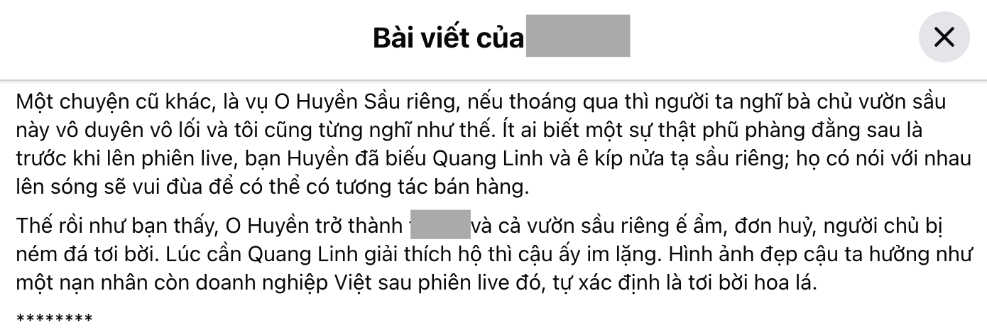 Gần đây nhất, cư dân mạng nhắc lại những lùm xùm cũ của Quang Linh Vlogs với O Huyền Sầu Riêng (Nguyễn Thái Huyền, SN 1988) vào thời điểm gần 1 năm trước. Trong một bài viết đang viral trên MXH, chủ nhân bài đăng cho hay có một sự thật phũ phàng rằng trước khi livestream, O Huyền đã tặng Quang Linh và ekip nửa tạ sầu riêng, cùng thảo luận khi lên sóng sẽ vui đùa để có tương tác bán hàng. Tuy nhiên cuối cùng, O Huyền trở thành người bị “ném đá” vì vô duyên, cả vườn sầu riêng ế ẩm, bị hủy đơn còn Quang Linh Vlogs im lặng.