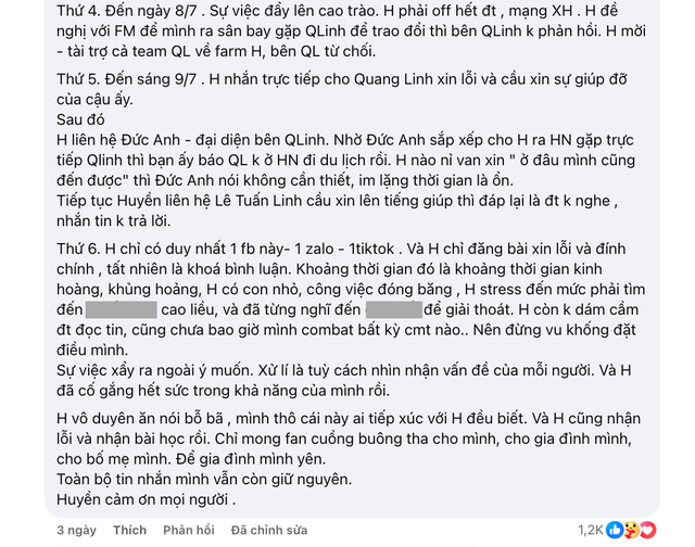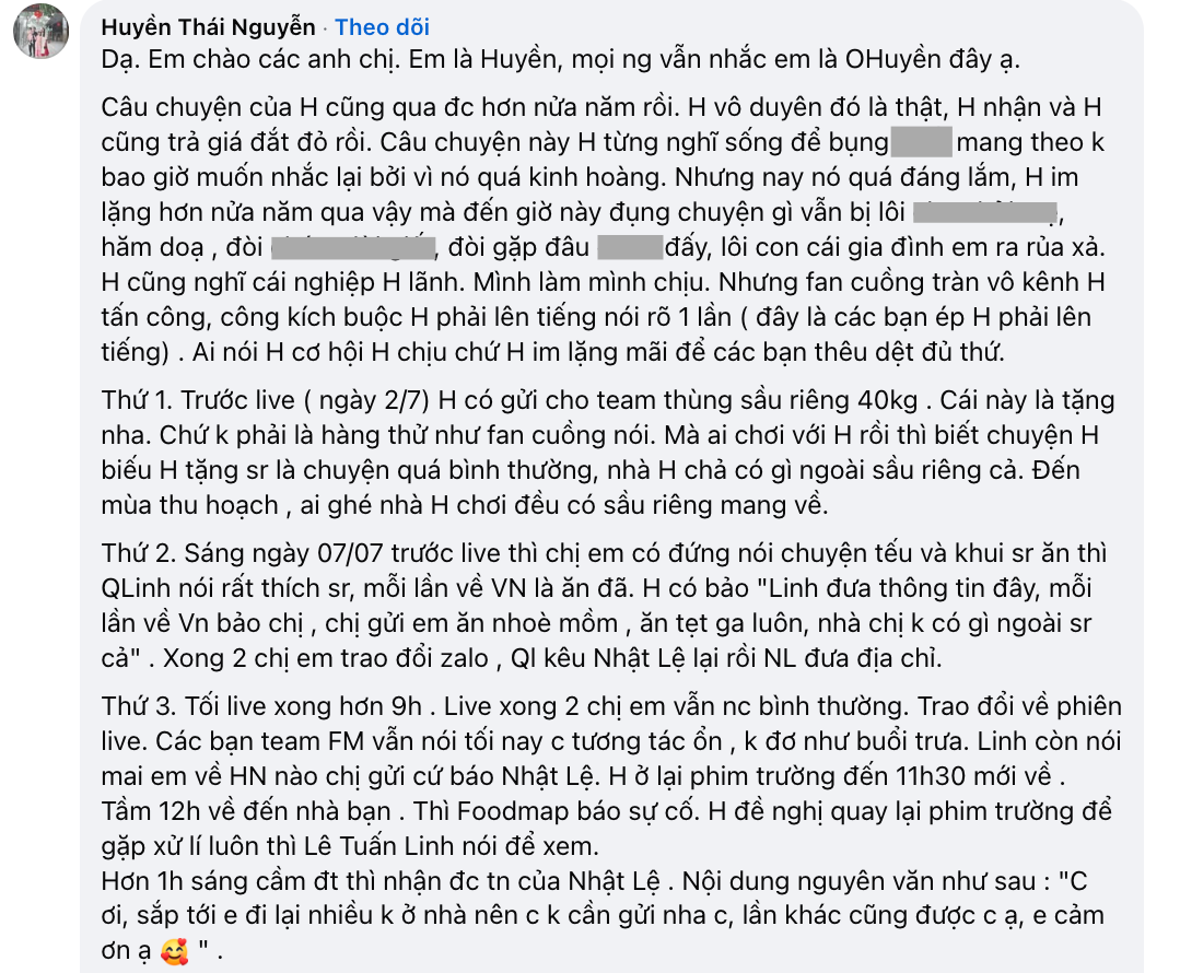 Cuối cùng, O Huyền Sầu Riêng viết: “Huyền chỉ có duy nhất trang này và chỉ đăng bài xin lỗi và đính chính, tất nhiên là khóa bình luận. Khoảng thời gian đó là khoảng thời gian kinh hoàng, khủng hoảng, Huyền có con nhỏ, công việc đóng băng…. Huyền còn không dám cầm điện thoại đọc tin nhắn, cũng chưa bao giờ combat bất kỳ bình luận nào nên đừng vu khống đặt điều mình.
