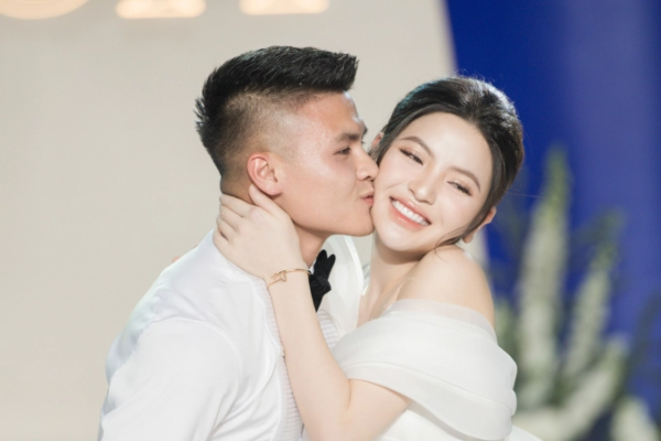 Đám cưới Quang Hải và Chu Thanh Huyền khép lại bằng một nụ hôn ngọt ngào mà chú rể dành cho cô dâu của đời mình.