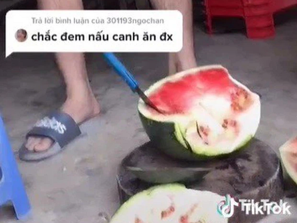 Ôm quả dưa rõ to ra sân hì hục bổ với mong muốn được một lần ăn cho đã thèm, chàng trai gặp cái kết không thể rầu hơn nữa.