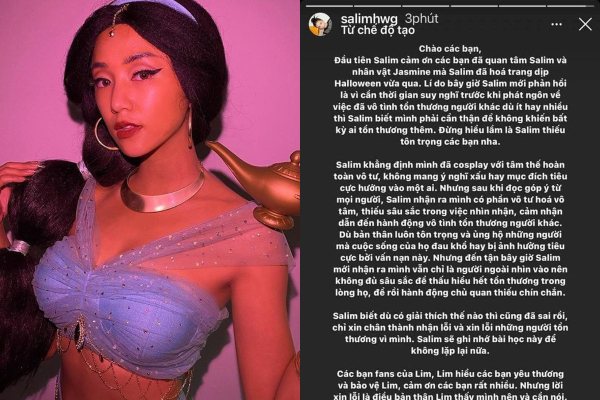 Salim đã lên tiếng xin lỗi và xoá bỏ hình ảnh hoá trang này trên MXH.