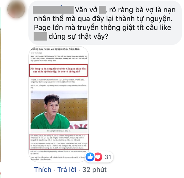 - "Nạn nhân bị xâm hại vốn đã luôn phải đối mặt với sự dị nghị, bàn tán, đàm tiếu của đám đông xung quanh. Vậy mà đối với cô nạn nhân của vụ này lại còn bị một page có gần 5 triệu người theo dõi đăng bài bịa đặt hết sức bẩn thỉu, cô ấy và gia đình, con cái sẽ sống ra sao trước dư luận? Hàng xóm sẽ đàm tiếu thế nào, gia đình nhà chồng cảm thấy thế nào, các con đi học sẽ bị trêu chọc cười cợt ra sao khi mà họ đọc bài viết của Theanh28?