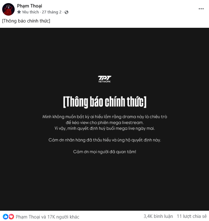 Từ đó đến nay (ngày 10/6), đã hơn 3 tháng trôi qua nhưng Phạm Thoại chưa có thêm bất cứ cập nhật nào khác liên quan đến công việc nói chung và livestream nói riêng. Hiện tượng lạ này khiến công chúng không khỏi thắc mắc: Phải chăng sự nghiệp của Phạm Thoại đang bị “đóng băng” sau lùm xùm từ thiện?