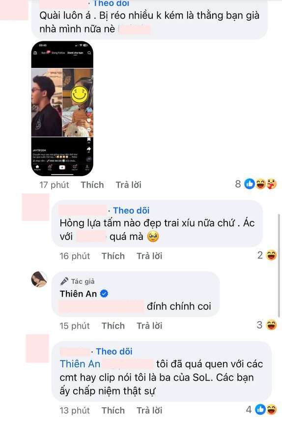 Trước những thông tin này, hội bạn của Thiên An cũng đã trực tiếp bình luận ngay dưới bài đăng của cô nàng. Họ cho biết một người bạn nam của Thiên An liên tục bị “réo tên” vì nghi ngờ là ba của bé Sol. Anh chàng này cũng trực tiếp bày tỏ thái độ mệt mỏi khi thường xuyên bị gán sai sự thật: “ Tôi đã quá quen với các bình luận hay clip nói tôi là bà của Sol. Các bạn ấy chấp niệm thật sự”.