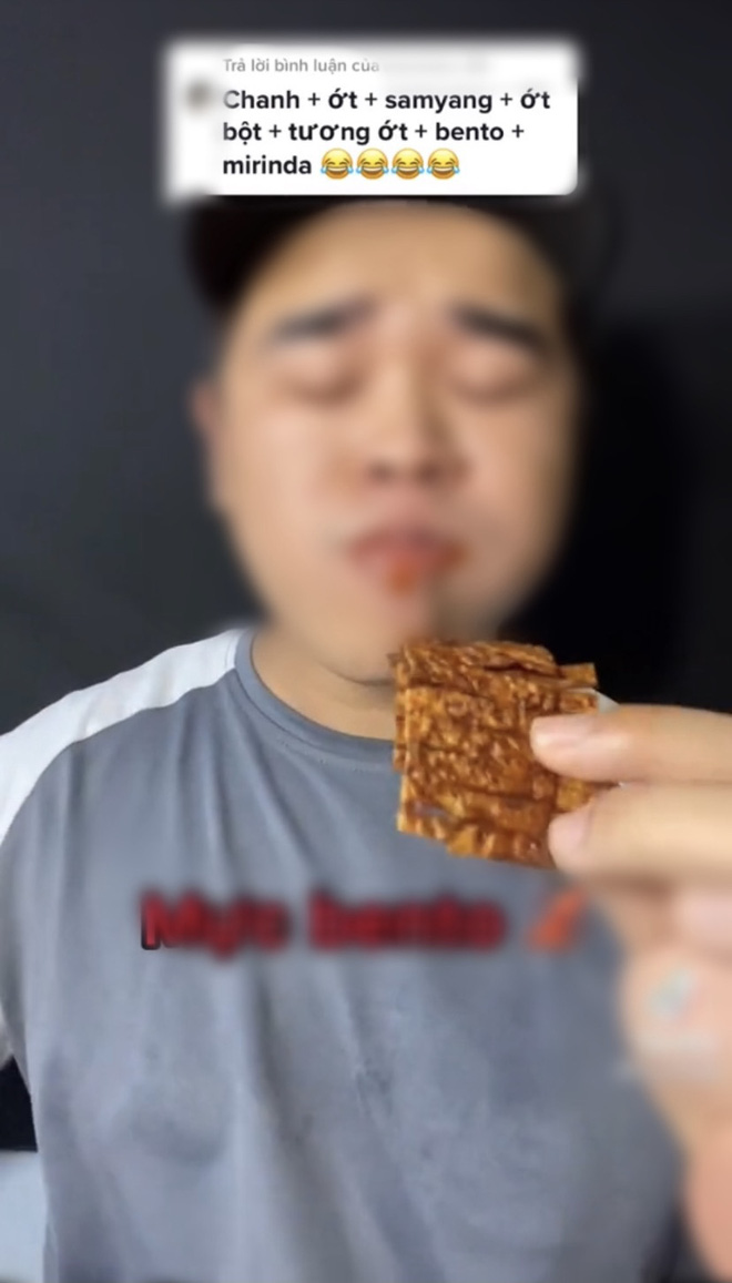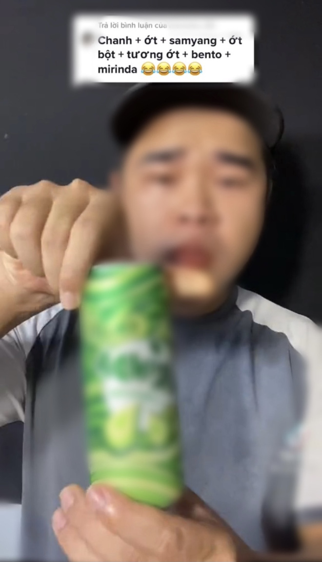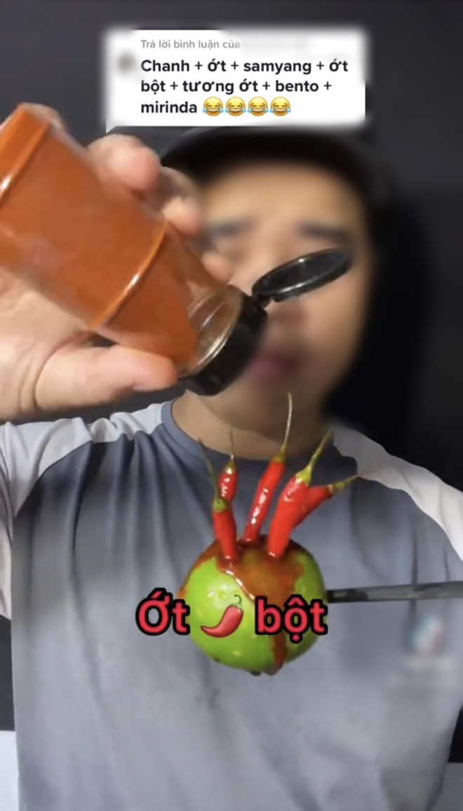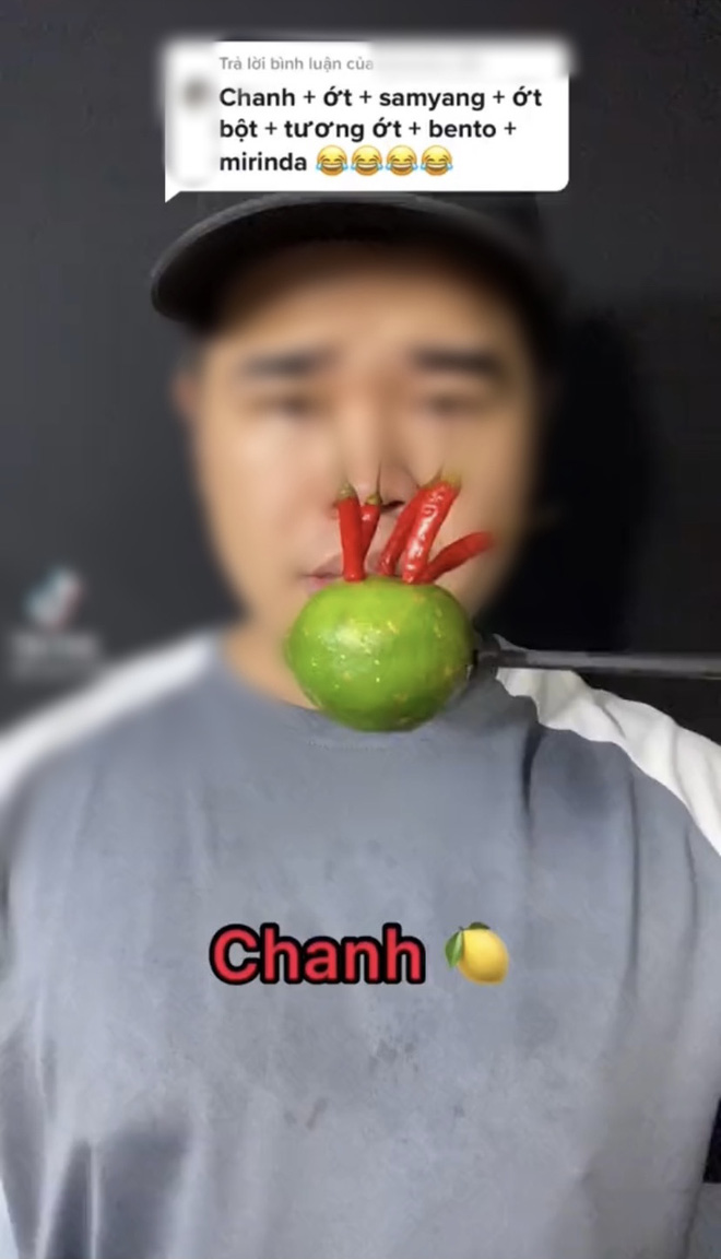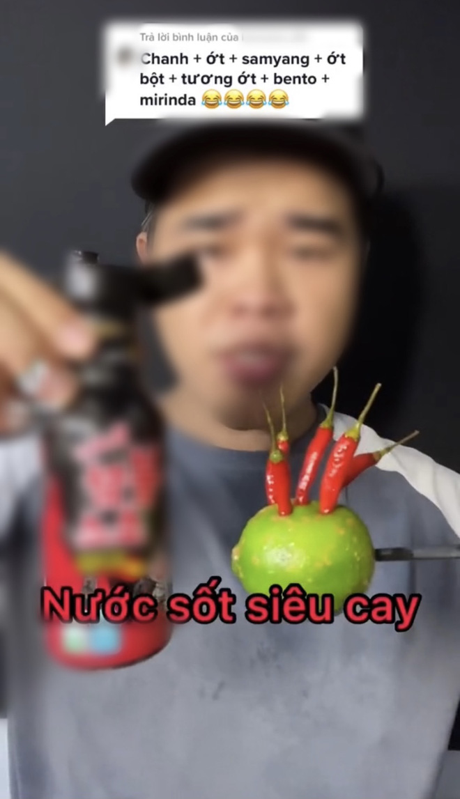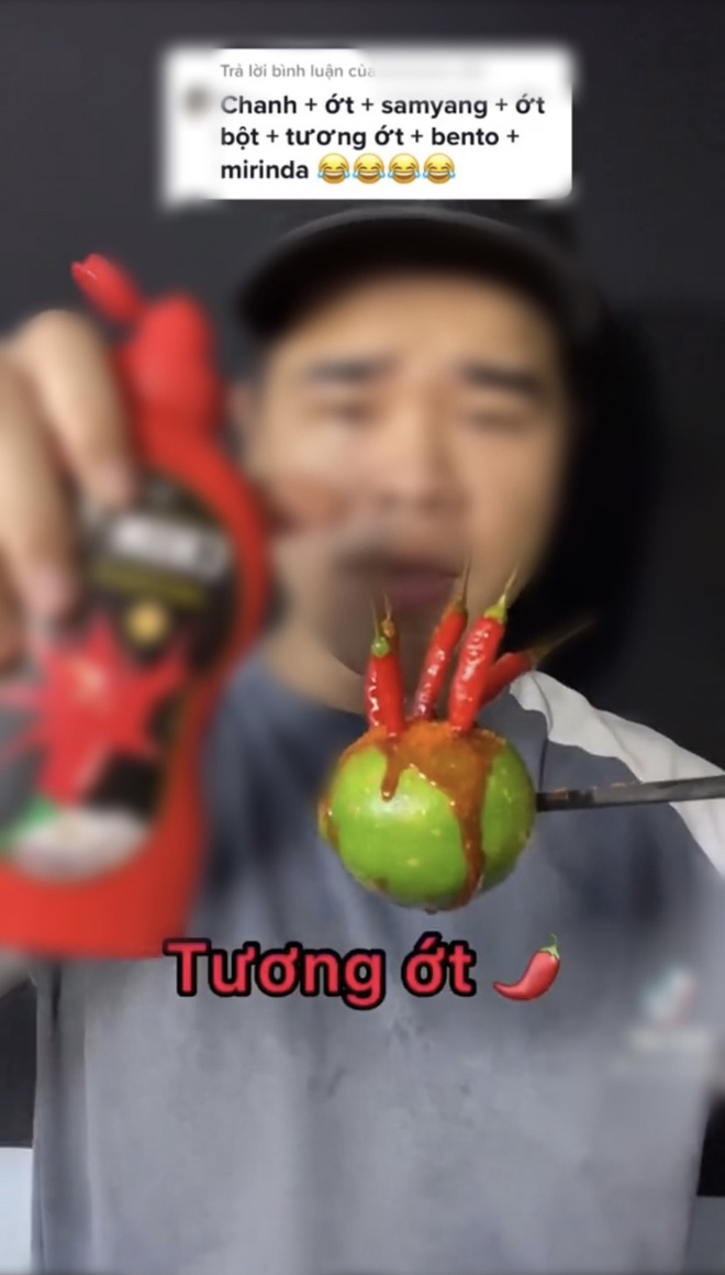 Chủ video là một TikToker chuyên thực hiện các clip ăn siêu cay, mukbang thập cẩm với những video đều đạt hàng triệu view. Trong clip này, anh chàng đã nhận lời thách từ một comment gợi ý ăn theo combo gồm: chanh, ớt, nước sốt siêu cay, ớt bột, tương ớt, mực cay, nước có ga. Nghe thôi đã thấy hại dạ dày!