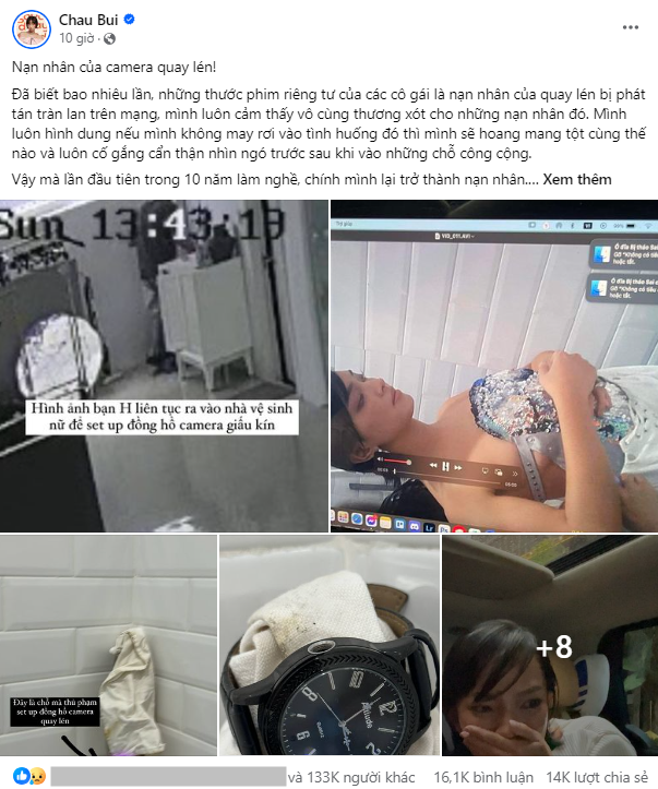 Đó là những bình luận ở "phía bên kia" vụ việc Châu Bùi bị đặt camera quay lén trong nhà vệ sinh diễn ra tại một studio ở Quận 3. Hiện tại, cô đã trình báo vụ việc lên cơ quan chức năng và trong quá trình hợp tác tố giác tội phạm.