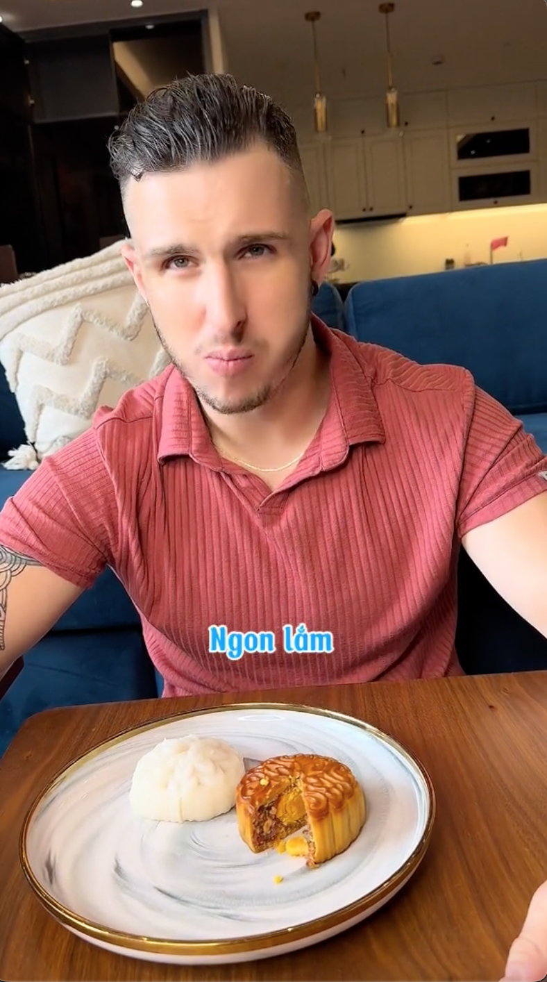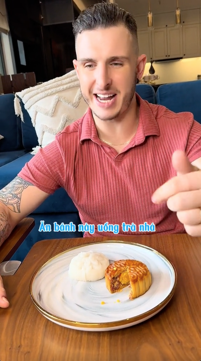 Đáng chú ý, vừa mới ăn thử 1 miếng bánh nướng nhân thập cẩm, anh chàng đã lập tức quay ra "đòi" vợ lấy cho mình 1 cốc trà để uống kèm. Anh còn hỏi trêu vợ: "Vợ có phải người Việt Nam không?"... Có vẻ như anh đã biết tới cách ăn bánh Trung thu và uống kèm trà xanh của nhiều người Việt.