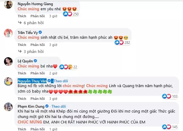 Dưới bài đăng hiện đã 51 nghìn lượt thích, rất nhiều đồng nghiệp, bạn bè, người hâm mộ... gửi lời chúc mừng đến cặp đôi như Tiểu Vy, Hương Giang, Phương Nga, Thụy Vân, bà trùm Kim Dung, Thanh Tú, Lệ Quyên...