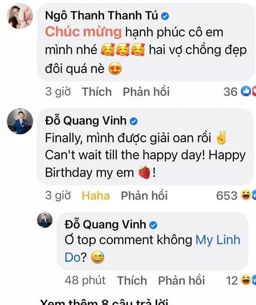 Đáng chú ý, một bình luận chiếm sóng hơn cả đến từ vị trí của anh trai của Đỗ Vinh Quang - con trai cả bầu Hiển: "Finally, mình được giải oan rồi. Can't wait till the happy day. Happy birthday em dâu".