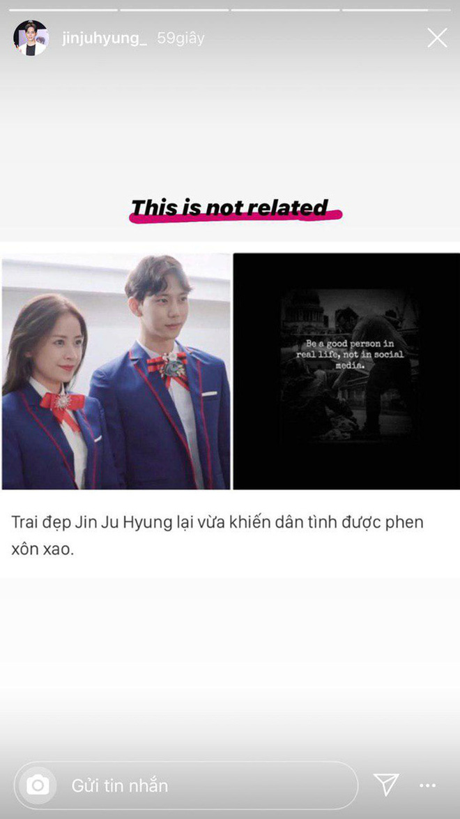 Tuy nhiên sau đó, tình cũ Chi Pu đã nhanh chóng xoá story ẩn ý kia và lên tiếng đính chính. Cụ thể, Jin Ju Hyung viết: "This is not related" (tạm dịch: Cái này không liên quan) đính kèm với ảnh tình tứ bên Chi Pu để minh oan.