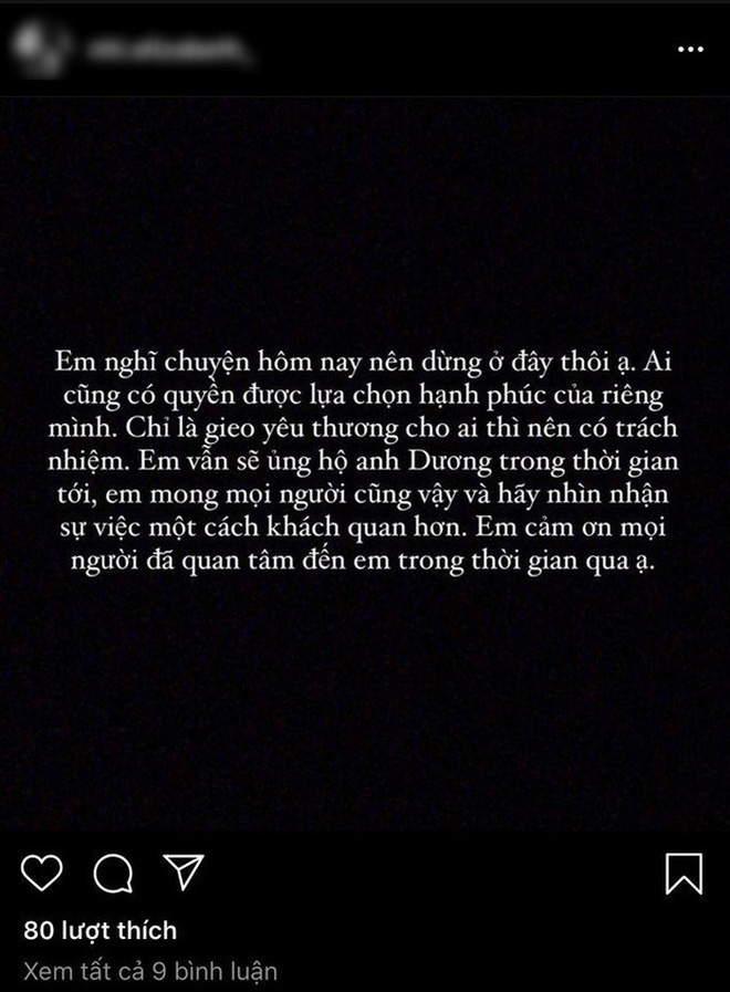 Khi nhiều người chỉ trích Tez vì không rõ ràng, rạch ròi trong chuyện tình cảm, D.N đã lên tiếng mong mọi chuyện dừng lại. Cô nàng cho biết mình vẫn ủng hộ Tez song cũng không quên "dằn mặt" anh chàng nhẹ nhàng bằng câu: "Ai cũng có quyền lựa chọn hạnh phúc riêng. Chỉ là gieo thương nhớ cho ai thì nên có trách nhiệm".