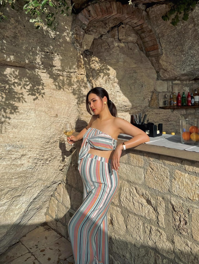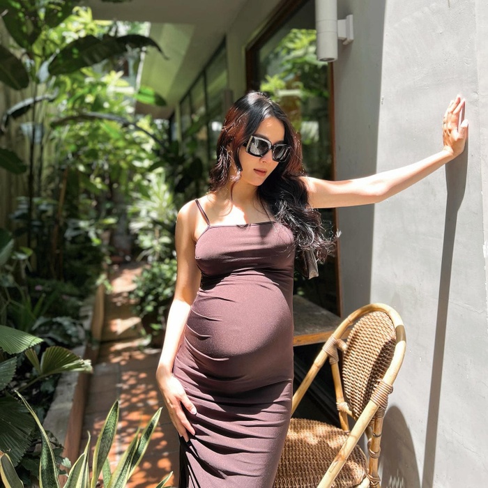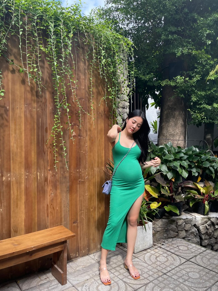 Hiện dù đã ở tháng thứ 8 của thai kỳ nhưng Karen Nguyễn mới tăng khoảng 12 kg. Cô tự tin diện đầm 2 dây, bó sát, cắt xẻ táo bạo hay những mẫu crop-top hở eo quyến rũ.