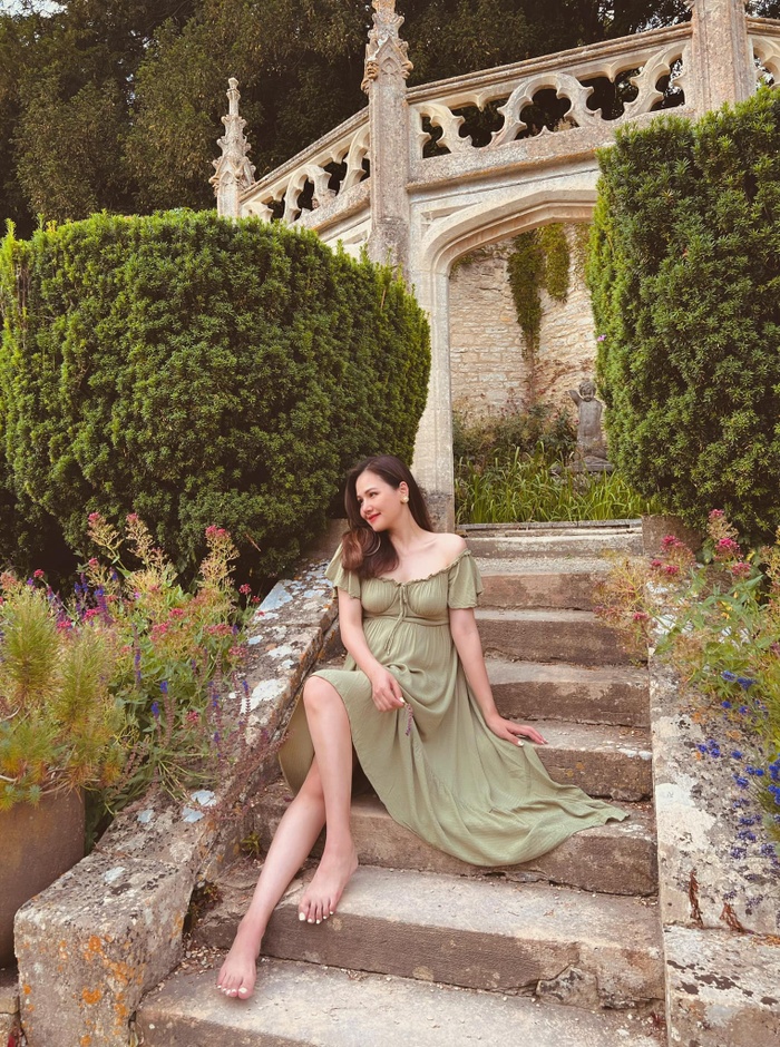 Karen Nguyễn tiết lộ, cô vẫn chưa có dấu hiệu rạn da nhờ cơ địa và chăm dùng dầu trị rạn. Nữ diễn viên hào hứng viết khi khoe loạt ảnh bầu đẹp rạng ngờ: "Bầu bì không quên sống ảo là em".