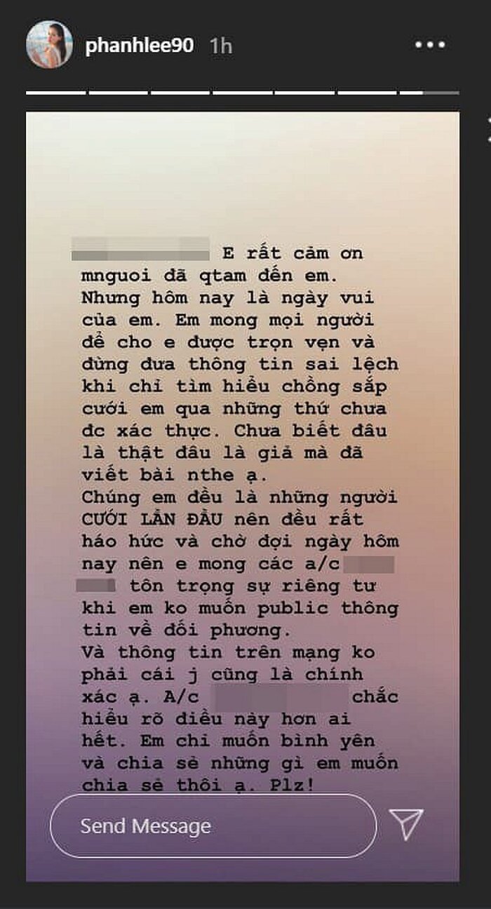 Chúng em đều là những người cưới lần đầu nên đều rất háo hức và chờ đợi ngày hôm nay nên em mong các anh chị tôn trọng sự riêng tư của em khi em không muốn public thông tin của đối phương. Và thông tin trên mạng không phải cái gì cũng là chính xác ạ. Anh chị chắc chắn hiểu rõ điều này hơn ai hết. Em chỉ muốn bình yên và chia sẻ những gì em muốn chia sẻ thôi ạ. Làm ơn”.