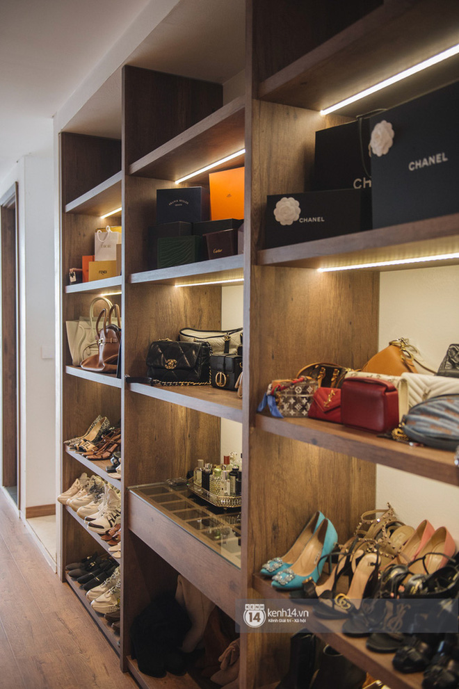 Ở nhà cũ, phòng thay đồ của cựu hot girl được thiết kế với tone đen tuyền sang chảnh hết nấc, phân rõ từng góc cho quần áo, giày dép, phụ kiện, nước hoa nhiều đến hoa mắt. Huyền Baby cũng thường xuyên sử dụng căn phòng này để cho ra đời những bức ảnh đậm mùi tiền.
