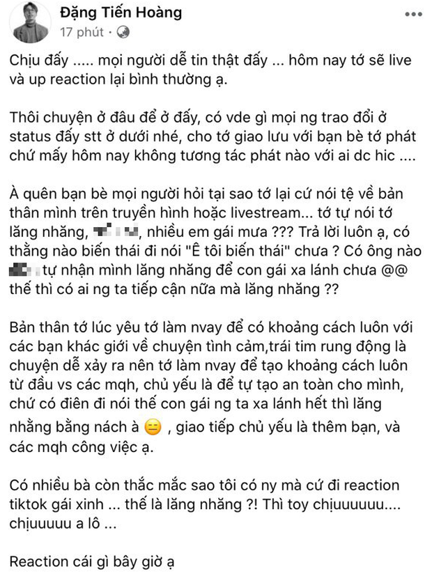 Lần này, phía streamer đã có phát ngôn chính thức về sự việc. Theo bài đăng của ViruSs, chàng streamer đình đám cho rằng mọi người "dễ tin người thật đấy". Đồng thời, anh chia sẻ thêm về lí do thường nói mình lăng nhăng trên các đoạn livestream cũ là để luôn giữ khoảng cách với các bạn khác giới về chuyện tình cảm.